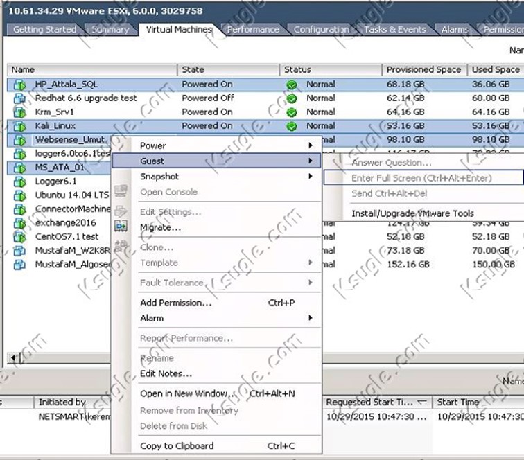 Host’a geliyoruz ve Virtual Machines tabına geliyoruz bu sekmeden güncelleştirme yapmak istediğimiz Vm’leri seçiyoruz sağ click ve Guest > Install/upgrade VMware Tools seçeneğini seçiyoruz.